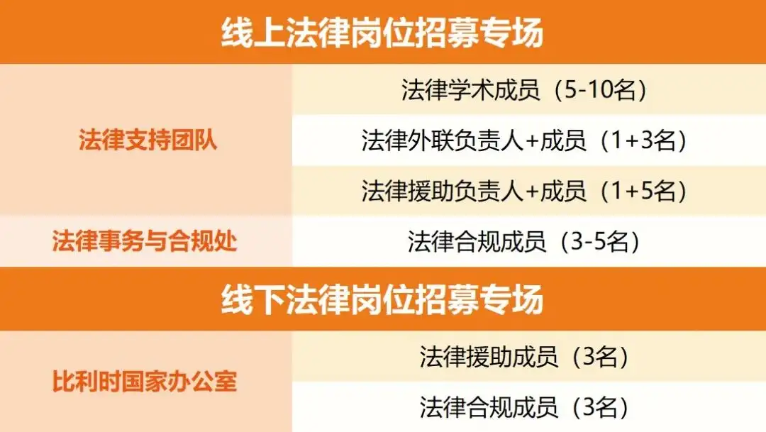 本次专项招募分为“线上法律岗位招募专场”和“线下法律岗位招募专场”。