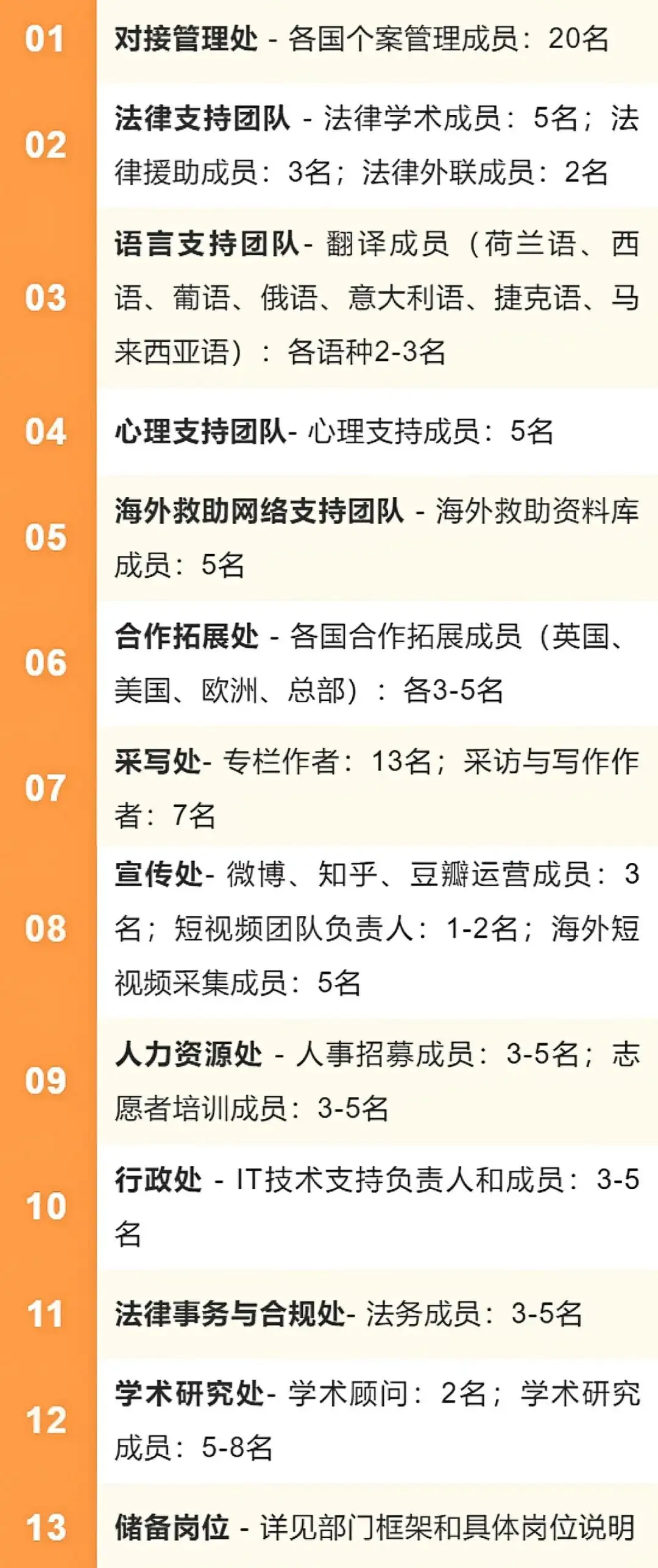 荷兰语翻译、西语翻译、葡语翻译、俄语翻译、意大利语翻译、捷克语、马来西亚语成员:各2-3名
