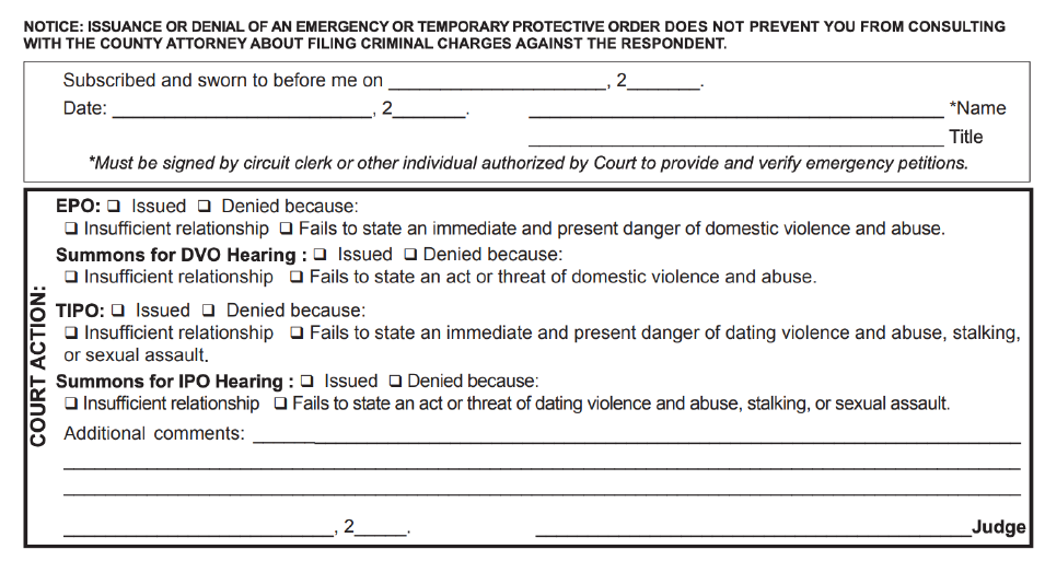 在依据申诉书决定是否存在家庭暴力或约会暴力之后,法官可以签发两种特别的保护令,包括应急保护令和临时人际保护令。