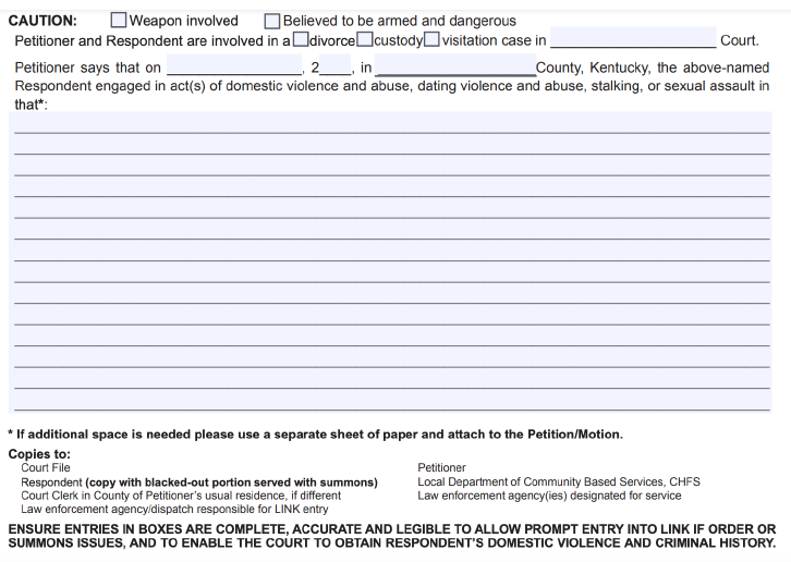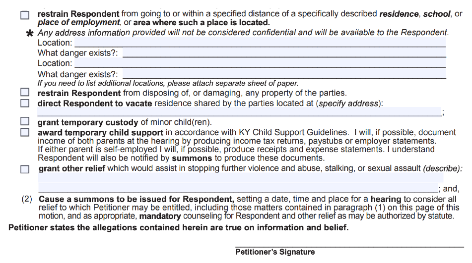 • 法院可命令施暴方离开二人共同住所(在肯塔基州,这一点十分重要,因为它允许受害者退出租赁协议。这项改革之前,受害者仍然要遵守租赁协议,要么或者继续支付租金,要么如果受害者和施暴者双方都他们不付支付房租,施暴者也不支付,他们的信誉报告将收到影响,。或者最坏的情况是,他们继续与施暴者生活在一起,双方仍然同居,施暴者也将继续威胁到他们受害者的经济安全乃至生命安全。);