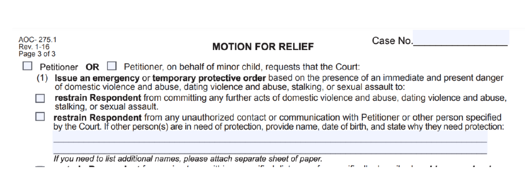 • 禁止所有形式的联系(禁止施暴者和受害者之间通过短信、电子邮件等联系或表示歉意,禁止通过受害者家人与其取得联系,所有这些必须禁止这些行为,否则施暴者可能违反保护令);