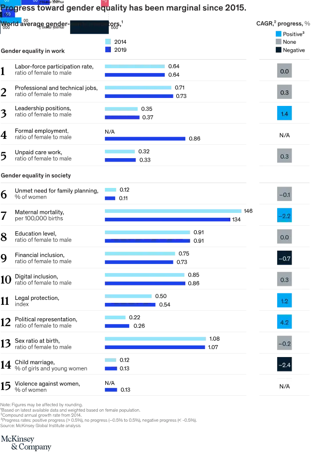 在 MGI 的 2015 年平价报告中,在不平等最集中的地方,性别行动将产生最大阻力。无论女性生活在发达经济体还是新兴经济体,性别不平等都十分严峻:经济潜力受阻(包括女性参与领导和工作)、花在家务上的时间、法律权利与政治代表性不足及针对妇女的暴力。如今,全球每 100 名男性担任领导职务,女性只有 37 名;全球三分之一的女性(包括美国等发达国家)在生命中的某个时候经历过来自亲密伴侣的暴力。 仅靠经济增长不足以保证进步;相比之下,在某些地区,经济增长反而可能有助于推进解决性别不平等。面临高质量工作的劳动力参与率低(在南亚、中东和北非以及撒哈拉以南非洲),孕产妇和生殖健康难(在撒哈拉以南非洲),不平等的教育(在南亚和撒哈拉以南非洲)、金融和数字排斥(在南亚、中东和北非以及撒哈拉以南非洲)以及女童脆弱性(在中国和南亚),经济增长有助于改善和进步。如非洲人均国内生产总值的增长能够提供更多的医疗保健服务,从而降低孕产妇死亡率;随着各国生活水平提高,女孩的教育水平也会提高。