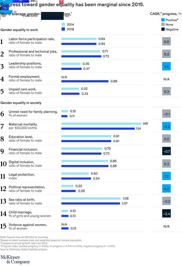在 MGI 的 2015 年平价报告中,在不平等最集中的地方,性别行动将产生最大阻力。无论女性生活在发达经济体还是新兴经济体,性别不平等都十分严峻:经济潜力受阻(包括女性参与领导和工作)、花在家务上的时间、法律权利与政治代表性不足及针对妇女的暴力。如今,全球每 100 名男性担任领导职务,女性只有 37 名;全球三分之一的女性(包括美国等发达国家)在生命中的某个时候经历过来自亲密伴侣的暴力。 仅靠经济增长不足以保证进步;相比之下,在某些地区,经济增长反而可能有助于推进解决性别不平等。面临高质量工作的劳动力参与率低(在南亚、中东和北非以及撒哈拉以南非洲),孕产妇和生殖健康难(在撒哈拉以南非洲),不平等的教育(在南亚和撒哈拉以南非洲)、金融和数字排斥(在南亚、中东和北非以及撒哈拉以南非洲)以及女童脆弱性(在中国和南亚),经济增长有助于改善和进步。如非洲人均国内生产总值的增长能够提供更多的医疗保健服务,从而降低孕产妇死亡率;随着各国生活水平提高,女孩的教育水平也会提高。