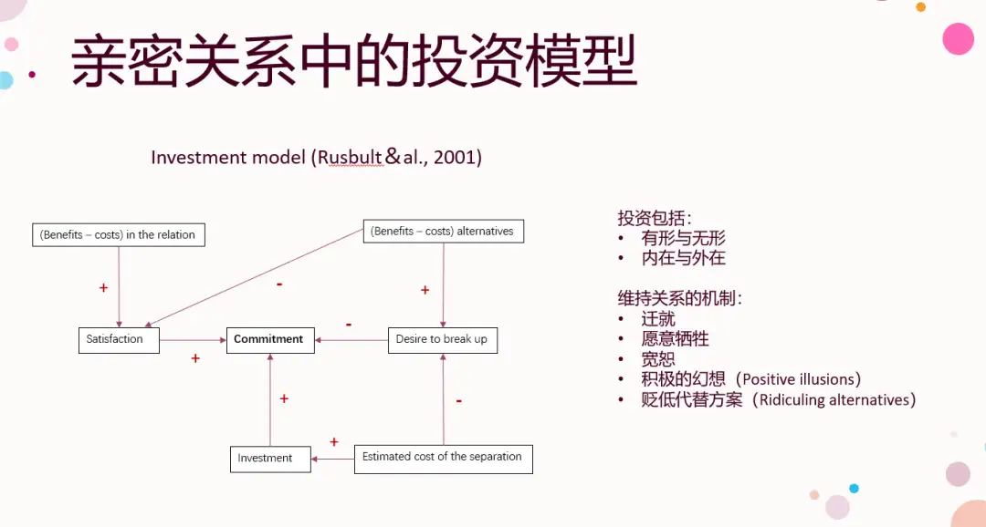 还有一些机制是可以维持关系的,比如说迁就愿意牺牲宽恕,积极的幻想。积极的幻想是包括觉得对方什么都好,我跟对方也会有一个美好的未来。最后是执意贬低代替方案,就是说主动去看不上那个备胎。