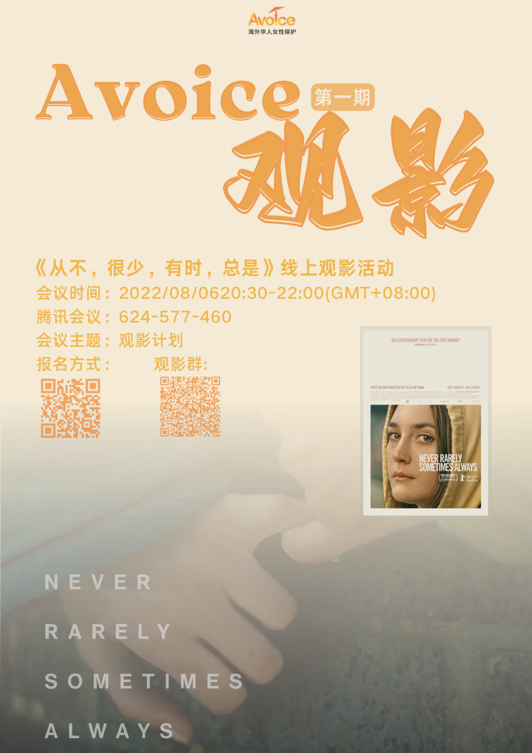 欢迎大家参与本期观影活动,我们预计在北京时间8月6日(星期六)晚上八点半至十点举办《从不,很少,有时,总是》线上观影活动。