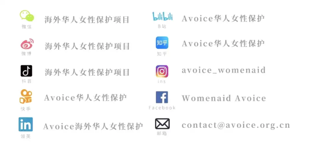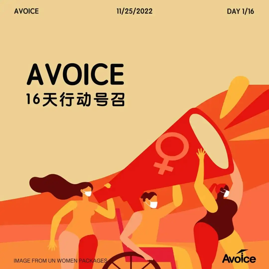 在今年联合国倡导的“消除性别暴力16日行动”中, Avoice(海外华人女性保护项目)将会在全平台(微信,小红书,微博,Instagram)联合 妇女领导的社会组织,其他致力于预防和回应性别暴力的社会组织,倡导性别平等的社会组织,更多男性以及幸存者,进行一系列线上、线下的关于性别暴力的科普以及倡导活动,期待你的参与和互动。