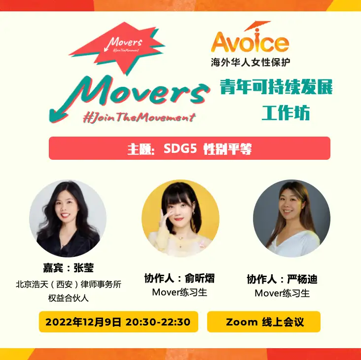 Avoice于12月9日晚上20:30 举行Movers性别平等工作坊,邀请反家暴领域著名律师张莹老师做分享。