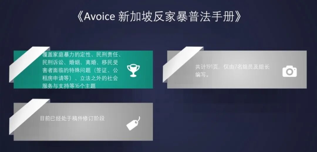 在这次的分享会中,她从历史角度详细介绍了新加坡反家暴法律的发展,并向参与者科普了Avoice编写的《Avoice新加坡反家暴普法手册》。