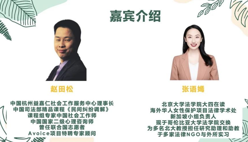 本次分享会有幸邀请到赵田松老师和 张语嫣学姐两位在反家暴、妇女权益保护等公益事业领域研究工作的专业嘉宾,和参与者共同探讨公共事务空间内的女性未来发展之路。