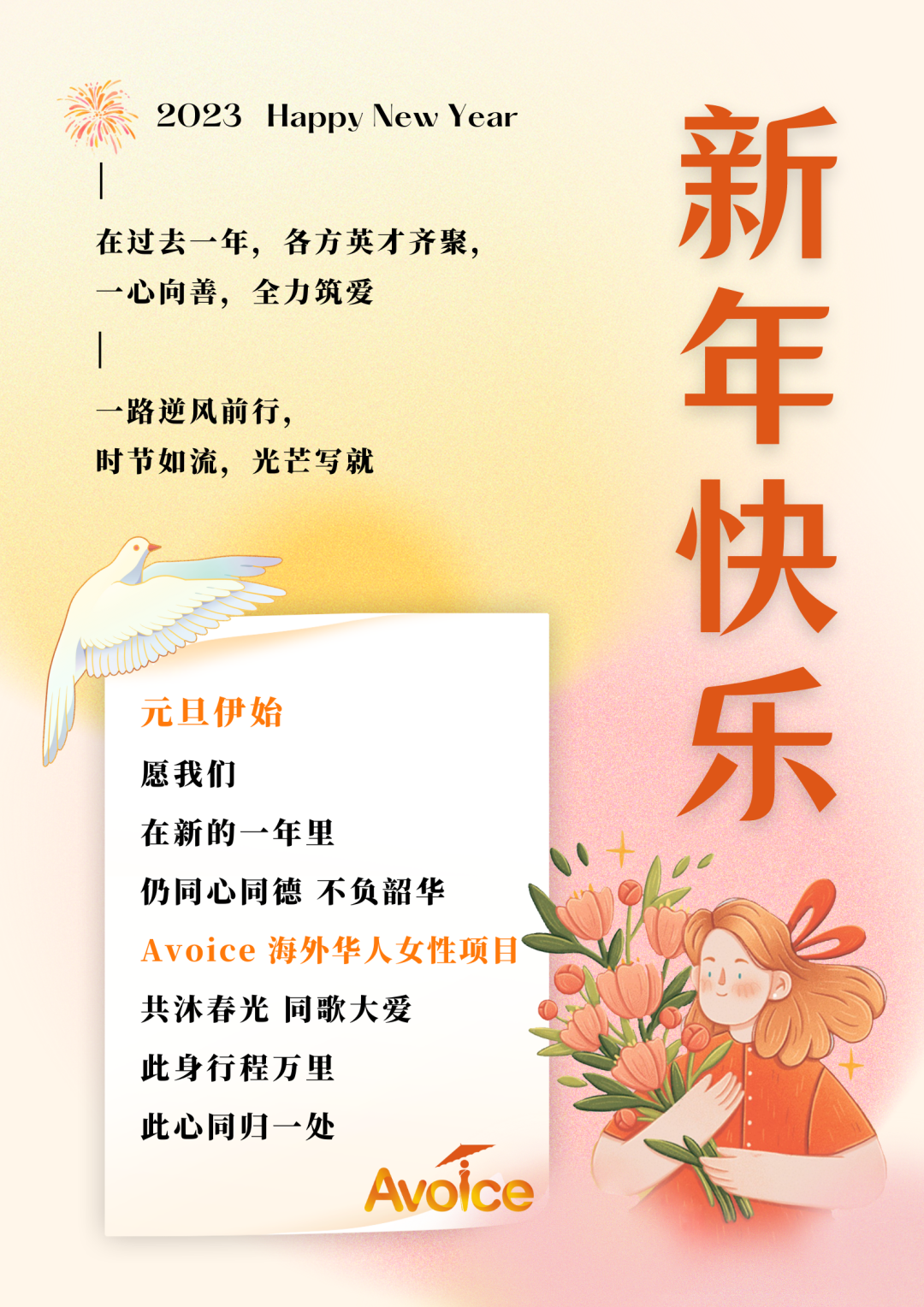 Avoice送来2023年新年祝福2022年12月31日元旦致辞这是来自Avoice海外华人女性保护项目的新年致谢与祝福。在过去一年,各方英才齐聚,一心向善,全力筑爱。一路逆风前行,时节如流,光芒写就。元旦伊始愿我们在新的一年里仍同心同德,不负韶华Avoice海外华人女性项目共沐春光,同歌大爱此身行程万里此心同归一处 撰稿 I Dolcia海报 I 孙羽欣 排版、封面制作 I 戴翰林