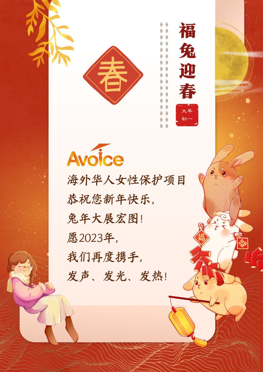 Avoice海外华人女性保护项目祝您兔年大展宏图2023年1月21日新春致辞“於菟绝绳去,顾兔追龙蛇。”岁月不居,时节如流。光阴寸短,光明路长。旧虎携陈符而去,去日难追。难忘怀,贤才智者齐聚,滴水之爱合流。新兔伴新桃而来,来日可期。今惟愿:千古八荒,同心所往。逆风执炬,灼灼生芒。惠及身旁,福泽四方。为爱发声,吾辈不肯迟。筵席不散,来日与今同。Avoice海外华人女性保护项目恭祝您新春快乐,兔年大展宏图!愿2023年,我们再度携手,发声、发光、发热! 撰稿 I Dolcia海报 I 孙羽欣 董竹青 排版、封面制作 I 戴翰林