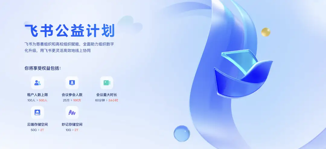 为进一步帮助社会组织社会化,更好地实现线上合作、项目管理,知识沉淀等需求,飞书团队开展公益计划,针对各高校课题组和学生组织、公益组织制定了一系列的优惠帮助项目。