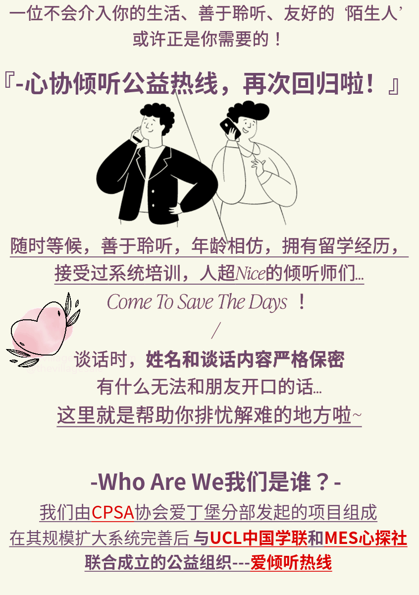Avoice推荐|留英夜晚EMO?公益免费心理倾听热线来啦!2023年10月13日------------------------------------------------------------------------排版/文图:Jamie 声明:本文为推荐推文,不代表本号观点或为文章内容作出任何承诺、保证,如有违规或侵权,请联系我们,我们将及时处理。