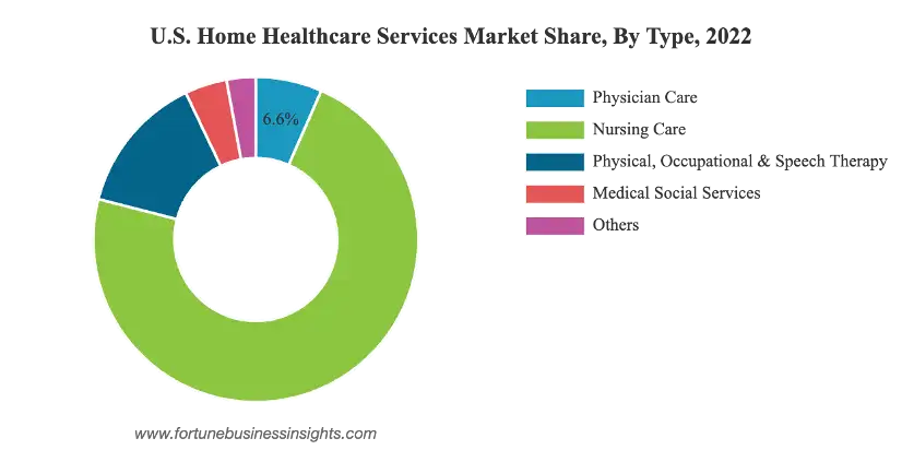 美国的健康护理行业属于美国医疗保健服务行业,在该行业内占据了最主要的市场份额。目前,美国医疗保健服务行业的市场规模较大,而且还在稳步上升 。根据美国家庭医疗保健服务市场规模报告显示,2022年美国家庭医疗保健服务市场规模为USD904.7亿美元(Fortune Business Insights, 2020),预计该市场将从2023年的960.8亿美元增长到2030年的1562.8亿美元(Fortune Business Insights, 2020)。该市场包括医生护理(Physician Care)、护工护理(Nursing Care)、身体、职业与语言治疗(Physical, Occupational, and Speech Therapy)、医疗社会服务(Medical Social Services),其中护工护理(Nursing Care)占据了最大的市场份额 (Fortune Business Insights, 2020)。