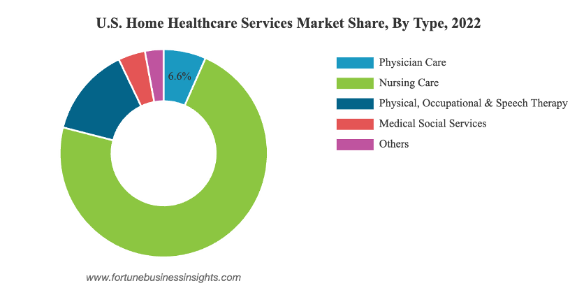 美国的健康护理行业属于美国医疗保健服务行业,在该行业内占据了最主要的市场份额。目前,美国医疗保健服务行业的市场规模较大,而且还在稳步上升 。根据美国家庭医疗保健服务市场规模报告显示,2022年美国家庭医疗保健服务市场规模为USD904.7亿美元(Fortune Business Insights, 2020),预计该市场将从2023年的960.8亿美元增长到2030年的1562.8亿美元(Fortune Business Insights, 2020)。该市场包括医生护理(Physician Care)、护工护理(Nursing Care)、身体、职业与语言治疗(Physical, Occupational, and Speech Therapy)、医疗社会服务(Medical Social Services),其中护工护理(Nursing Care)占据了最大的市场份额 (Fortune Business Insights, 2020)。