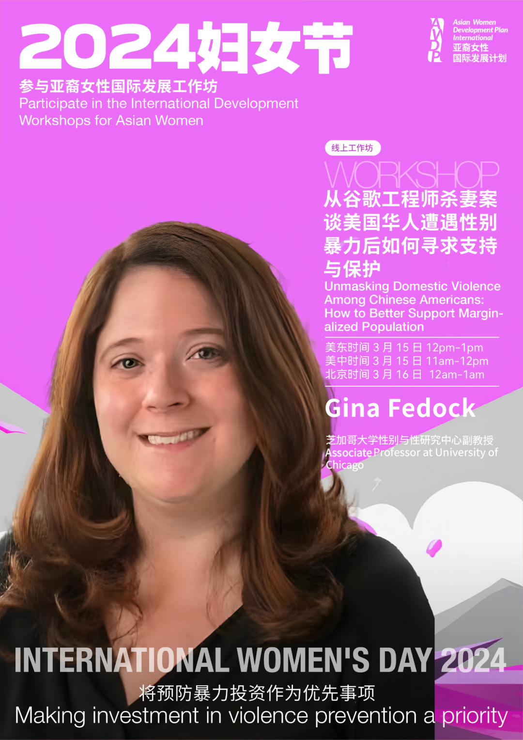 As we celebrate International Women’s Day and Women’s History Month, AWDPI has invited Associate Professor Gina at the University of Chicago, Crown Family School of Social Work, Policy and Practice. We will use the Google engineer murder case as a starting point to explore the definitions of domestic violence and gender-based violence. We aim to understand the impact of violence on physical and psychological health, discuss how discrimination based on race and immigration status can have significant impacts on individuals' willingness and ability to seek help, and explore how such discrimination affects the community in the long run. Finally, we will discuss how to better support survivors of gender-based violence.