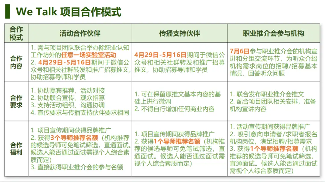 We Talk实验室专注职业赋能 ,内含职业认知工作坊入门版和进阶版、行业分享会、简历工作坊、单面/群面工作坊、职业推介会等多个精彩活动,旨在为学员提供切实指导,助力学员更好成长,奔赴人生理想。