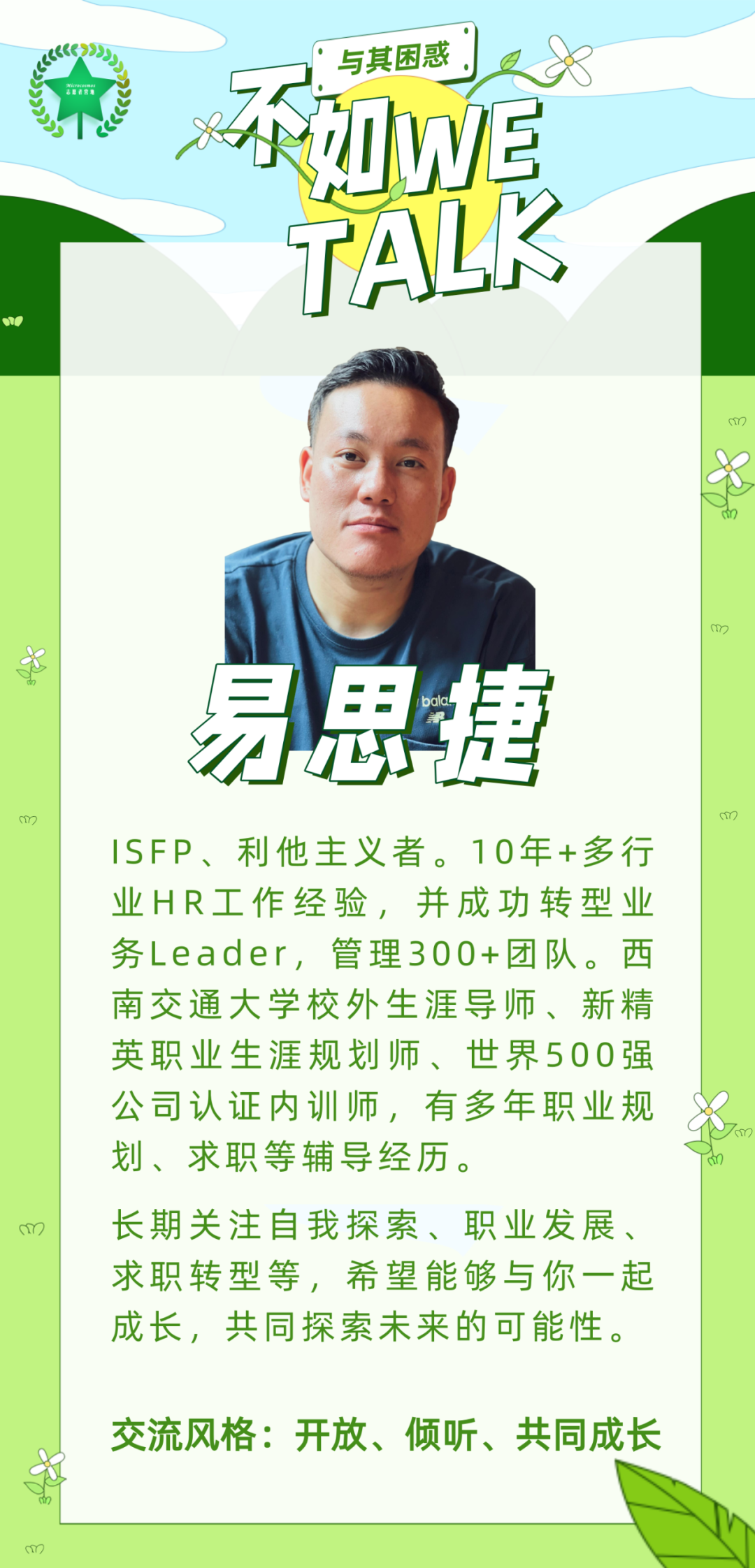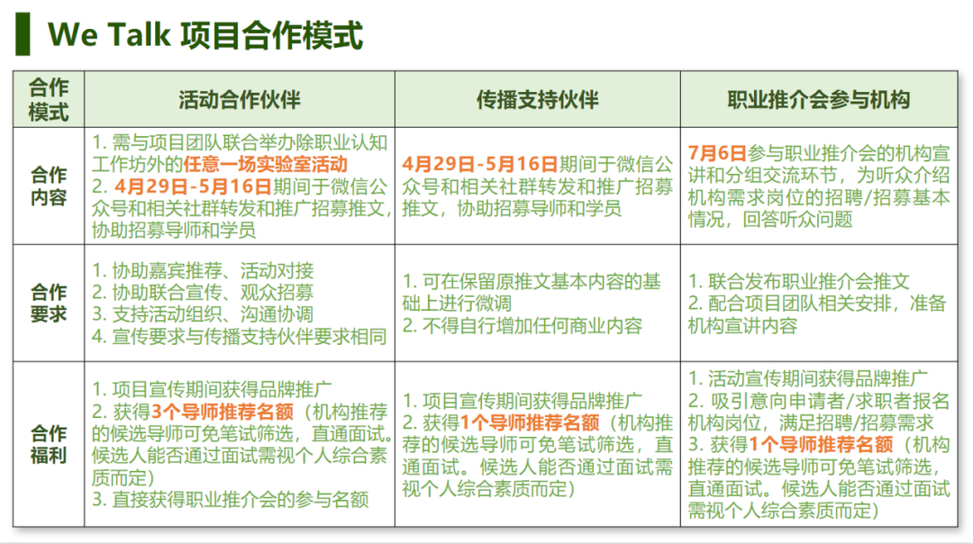 We Talk实验室专注职业赋能 ,内含职业认知工作坊入门版和进阶版、行业分享会、简历工作坊、单面/群面工作坊、职业推介会等多个精彩活动,旨在为学员提供切实指导,助力学员更好成长,奔赴人生理想。
