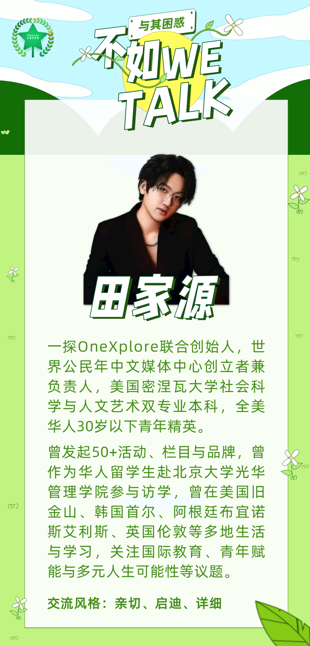 We Talk交流时专注青年交流,招募导师为学员提供长达一小时的一对一交流服务。目前开放的九个交流领域为学习、考公、竞赛、深造、科研、求职、创业、社会实践和人生规划。