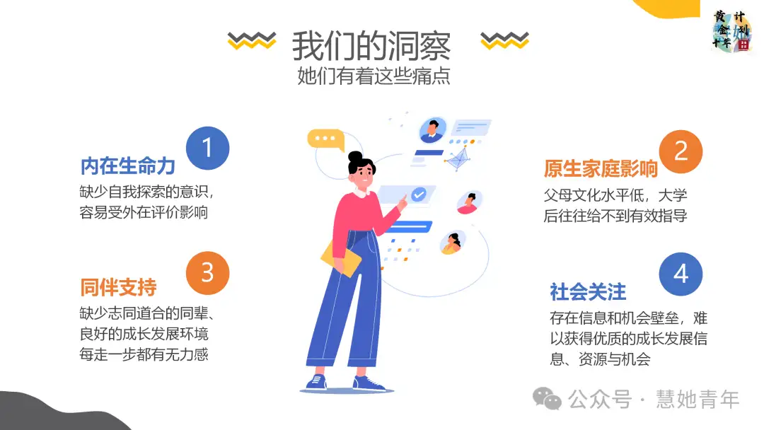 18-25岁是人生的关键转折期,女生们从高考进入大学、再到毕业迈进社会成为新人、经历职场成长、组建家庭等不同人生角色的转变,对每个人来说如此重要,而这个年龄段的女生又是如此迷茫没有方向,倘若能引入生命教练、导师、朋辈的支持,同时又给予实践创造的机会,这些经历为未来生命成长奠定精神和物质基础,甚至能影响10年后的生活。