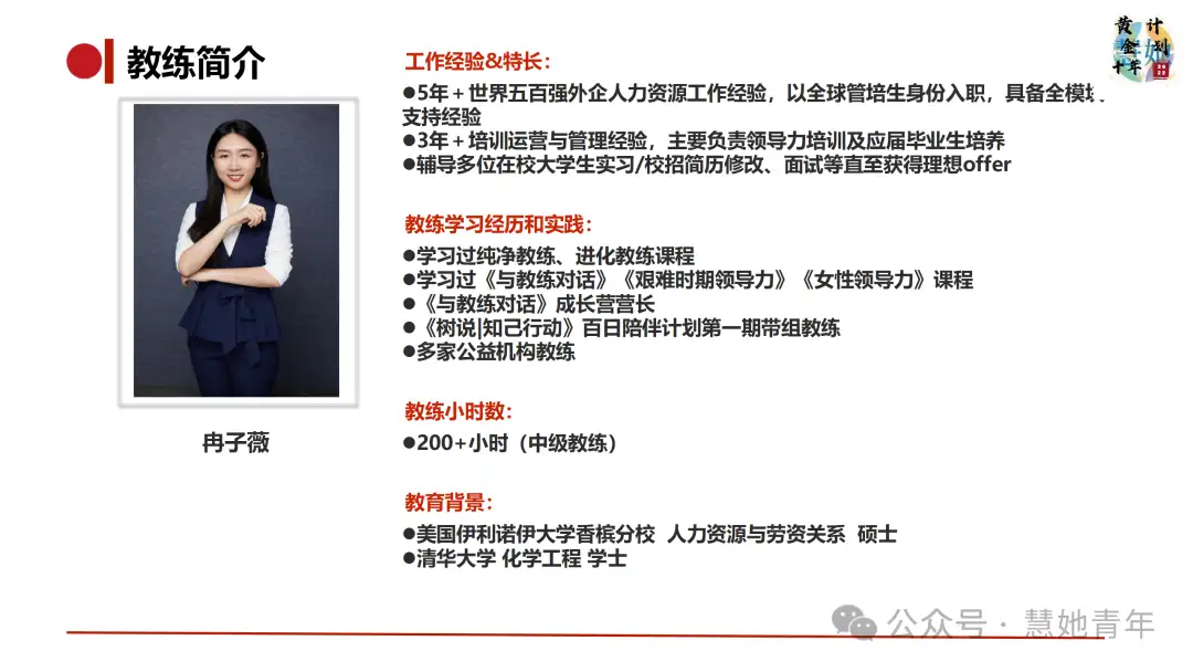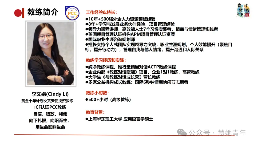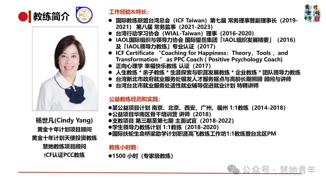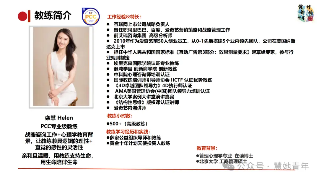 我们希望支持更多女生探索个人方向,助力女生们实现梦想,为此,慧她创始人孙冰慧对于有教练需求但在求学期间暂无支付能力的女生推出【黄金十年】公益项目。
