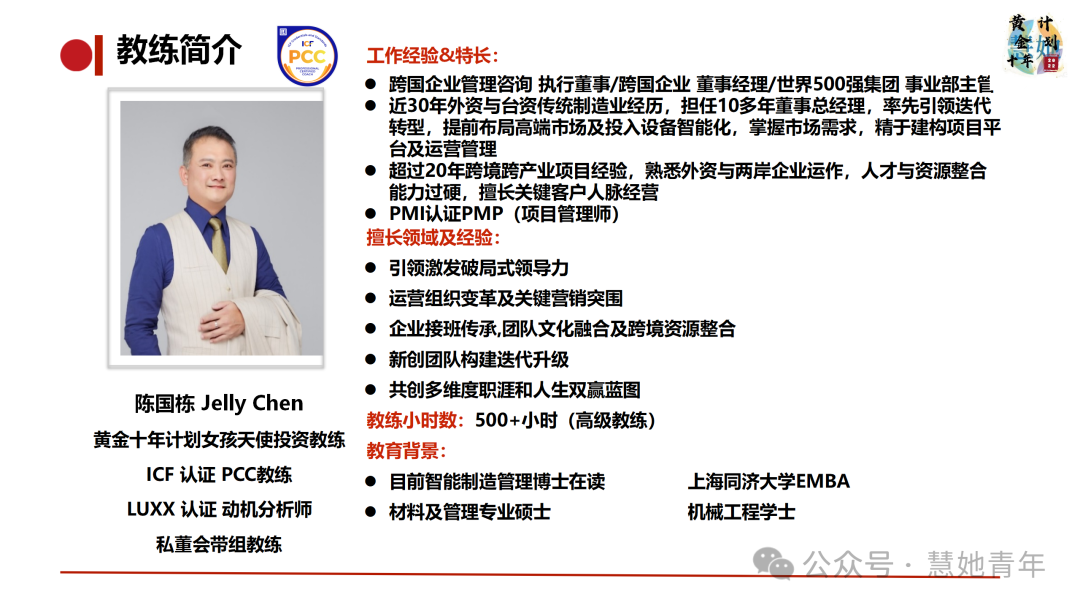黄金十年计划3.0邀请的教练背景多为世界500强企业高管/曾经担任过上市公司CEO/资深投资人/资深HR/创业者等,市面上每小时收费200-5000元/小时不等。