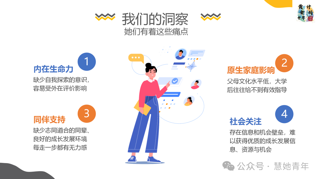 18-25岁是人生的关键转折期,女生们从高考进入大学、再到毕业迈进社会成为新人、经历职场成长、组建家庭等不同人生角色的转变,对每个人来说如此重要,而这个年龄段的女生又是如此迷茫没有方向,倘若能引入生命教练、导师、朋辈的支持,同时又给予实践创造的机会,这些经历为未来生命成长奠定精神和物质基础,甚至能影响10年后的生活。