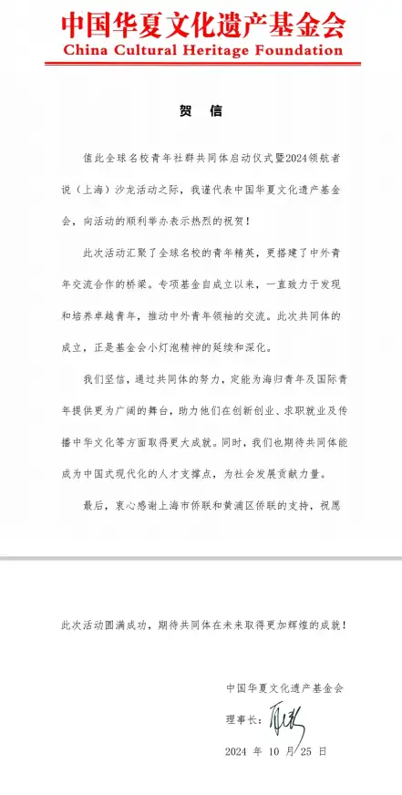 作为本次活动的亮点,“全球名校青年社群共同体”正式宣告成立。由中国华夏文化遗产基金会国际青年领航发展专项基金在上海市发起成立,以黄浦区侨联支持成立的海创青年领航发展中心为载体,搭建起连接全球名校青年社群的桥梁与平台。共同体定位为非注册性的公共服务平台,专注于服务全球名校青年社群,尤以侨界青年为主要服务对象。目标是通过共同体,发挥中外连接、文化传播及服务海归的桥梁作用,促进全球名校青年社群与各地政府及群团组织及更广泛社会资源的紧密联系与深度合作。中国华夏文化遗产基金会理事长耿静专门为活动发来贺信,期望共同体能成为中国式现代化的人才支撑点,为社会发展贡献力量。耿静指出,专项基金自成立以来,一直致力于发现和培养卓越青年,推动中外青年领袖的交流。此次共同体的成立,正是基金会小灯泡精神的延续和深化。“我们坚信,通过共同体的努力,定能为海归青年及国际青年提供更为广阔的舞台,助力他们在创新创业、求职就业及传播中华文化等方面取得更大成就。”