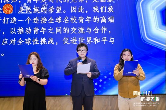 副秘书长苏润向共同体代表许迩加、朱家卉授予旗“全球名校青年社群共同体”旗帜,并与上海市侨办侨务事务处处长沈聪、上海市侨联基层工作部部长栾旭琛等分四批向“全球名校青年社群共同体”首批协同理事代表颁发“协同理事”证书。“青年兴则国家兴,青年强则国家强”。哈佛大学政治经济协会主席梁严、斯坦福中国教育实践与创新者协会联席主席李卓瑞、英国华威大学校友社群负责人朱虹慧共同宣读《全球名校青年社群共同体上海宣言》。他们强调,“全球名校青年社群共同体始终以国际青年领航为引领,以海创领航发展中心为载体,打造成为一个开放、包容、进取的组织。我们欢迎更多有志青年加入我们,与我们携手共进,共同开创属于青年的新时代!”“在上海这座充满活力的城市,我们共同见证了全球名校青年社群共同体的诞生。让我们携手并肩,以青春之我,创造青春之世界,打造中国式国际青年共同体,为构建人类命运共同体贡献青春力量!”