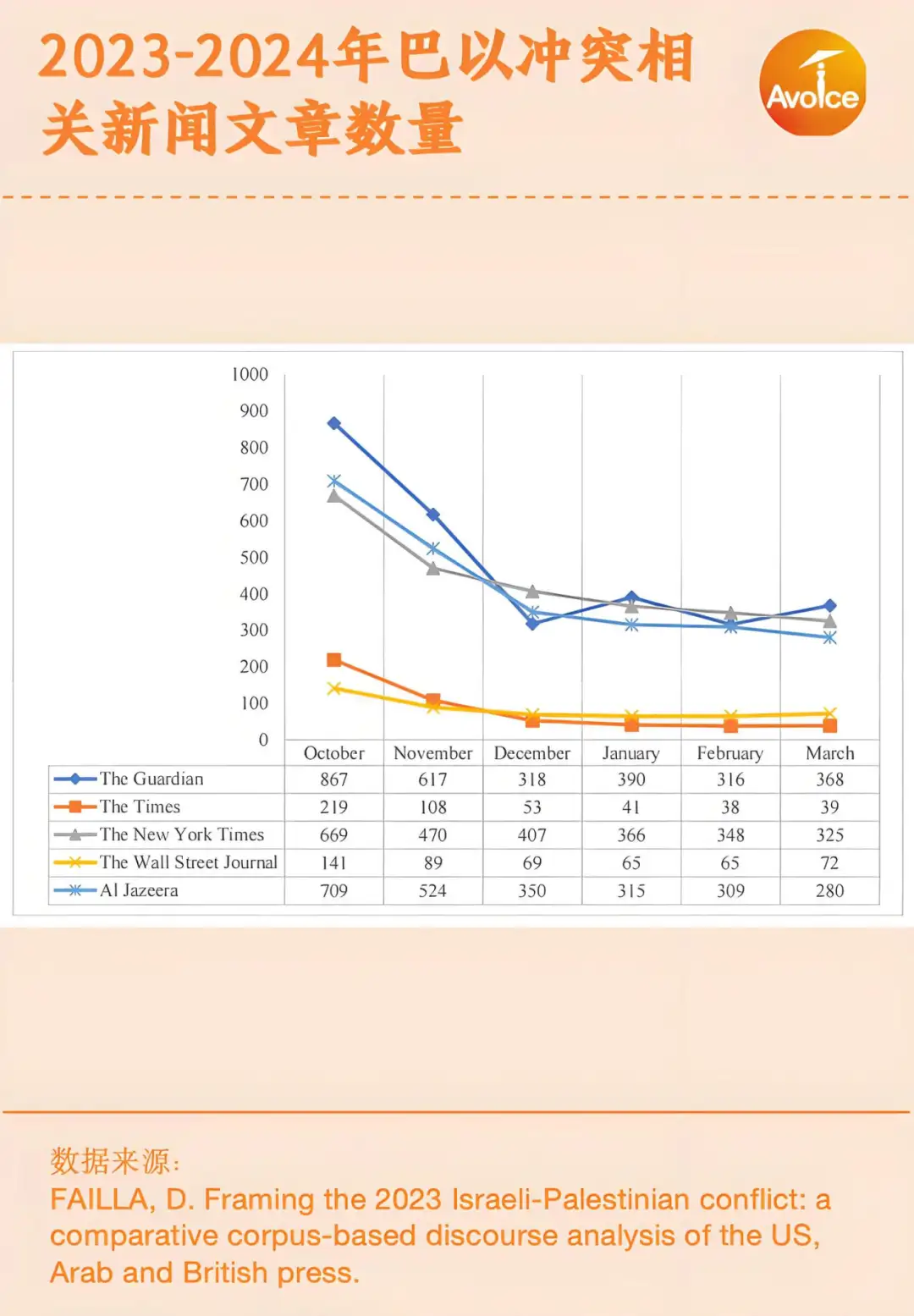 FAILLA分析了《卫报》、《泰晤士报》、《纽约时报》、《华尔街日报》以及半岛电视台2023-2024年关于巴以冲突的报道。从报道数量来看,五家媒体关于巴以冲突的报道呈下降趋势。从报道倾向来看,《华尔街日报》和 《泰晤士报》传统的西方报纸倾向于使用“占领”、“占有”这样的词汇来描述以色列的军事行动,而半岛电视台则倾向于使用“屠杀”和“攻击”。在3月1日的大屠杀中,《泰晤士报》写道大多数巴勒斯坦人死于踩踏事件,从而规避掉了造成死亡的真正的始作俑者。此外,西方媒体虽然报道了加沙地区陷入饥荒、营养不良和缺乏医疗设备的现状,但是对于资源短缺的原因则只字不提,从而减轻了以色列的责任。