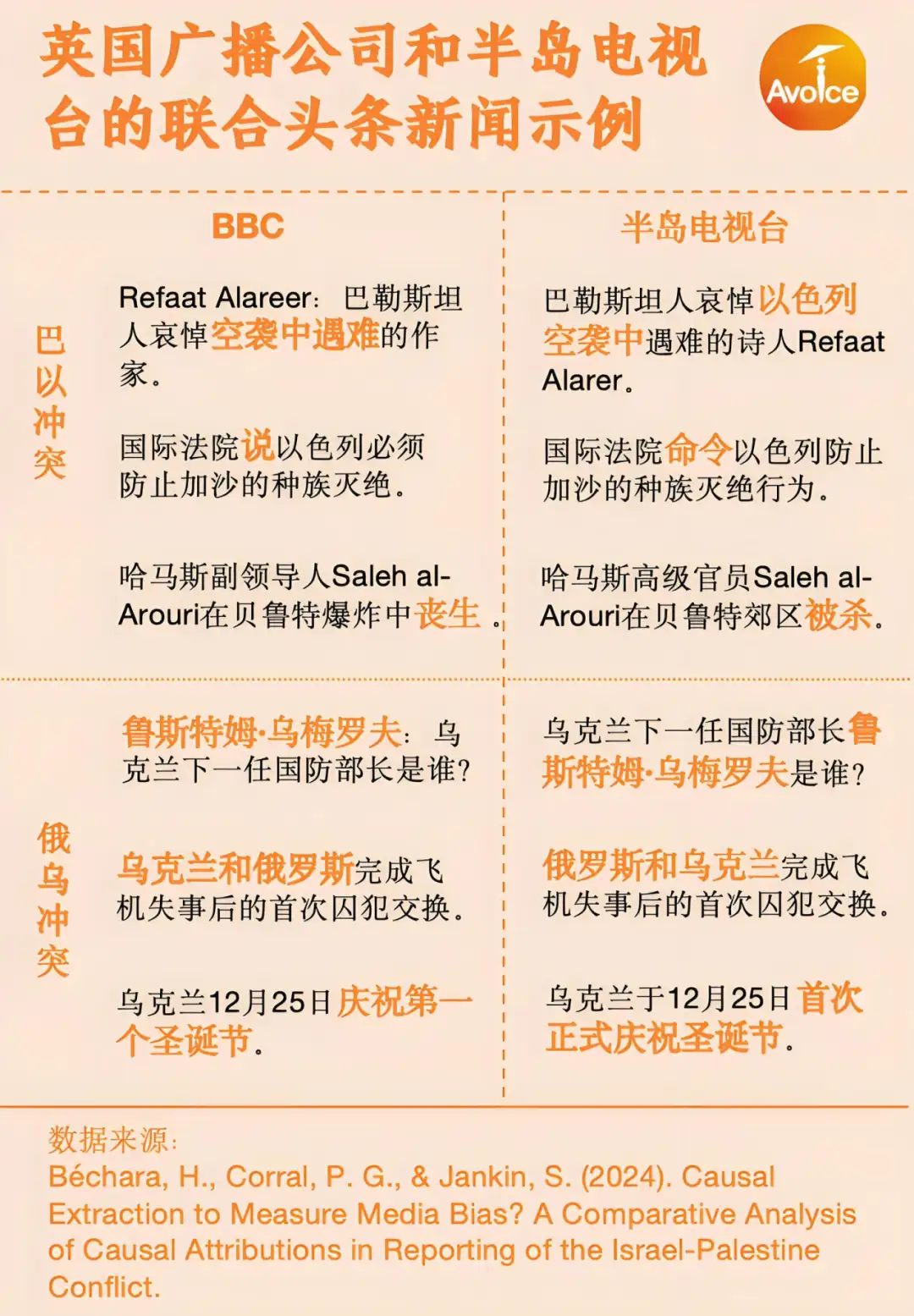 Béchara从因果推断对角度对比了2023年10月7日以来BBC和半岛电视台英语频道关于俄乌冲突和巴以冲突的报道,发现在BBC 784个关于俄乌冲突的头条新闻中,约有236个(30%)包含因果关系,而巴以冲突的头条新闻只有225个(28%)。不愿意在头条新闻中说出肇事者的名字是BBC所独有的,例如,“据报在最近的袭击中被打死”或“在难民营中有数十人被打死”等短语没有明确指出以色列是原因,只有1%的描述死亡和破坏的因果句子将原因直接归因于以色列,这种倾向反映了通过不作为而产生的隐含偏见,从而免除了一方的直接责任。