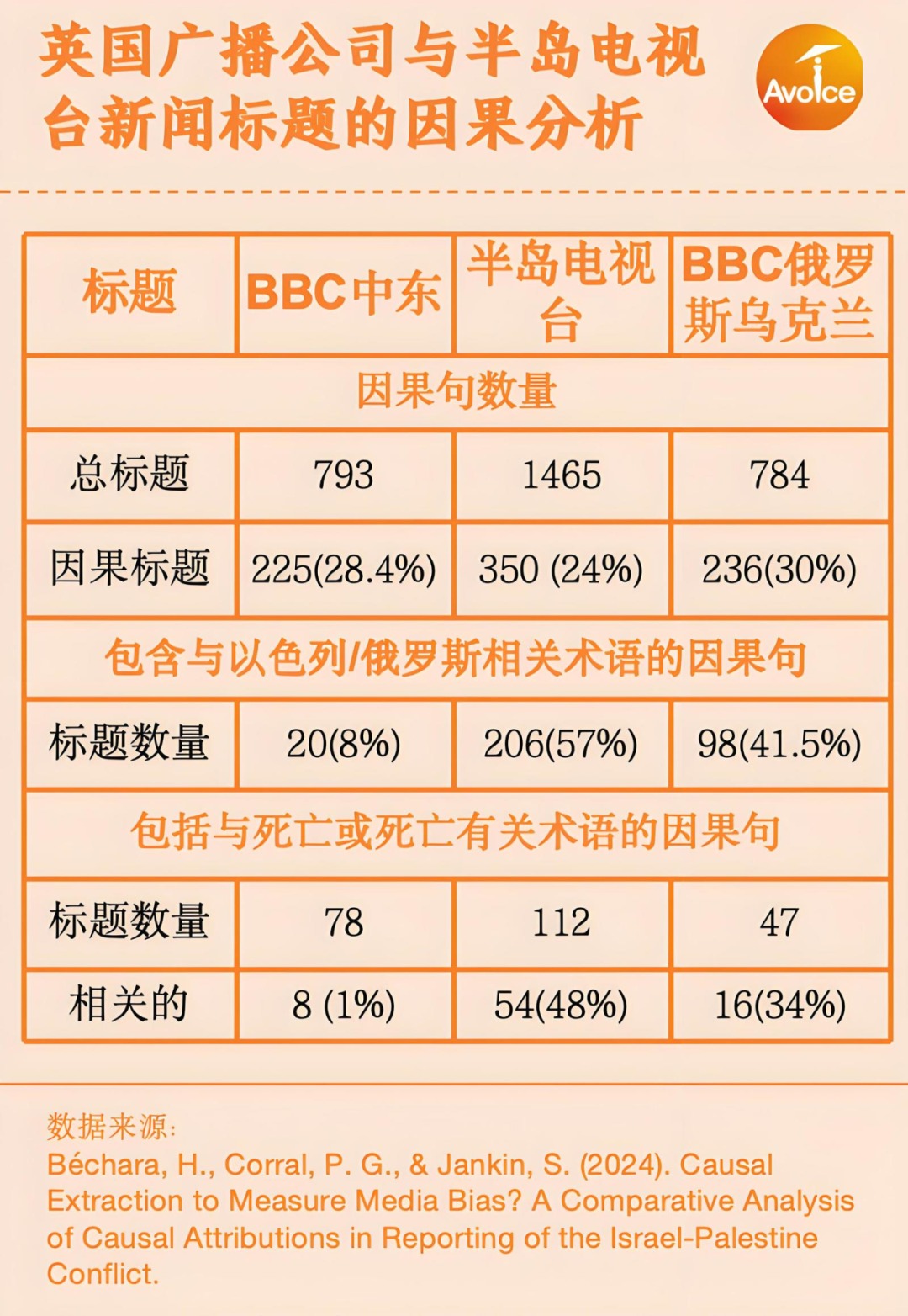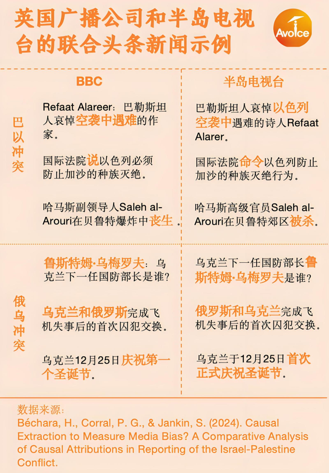 Béchara从因果推断对角度对比了2023年10月7日以来BBC和半岛电视台英语频道关于俄乌冲突和巴以冲突的报道,发现在BBC 784个关于俄乌冲突的头条新闻中,约有236个(30%)包含因果关系,而巴以冲突的头条新闻只有225个(28%)。不愿意在头条新闻中说出肇事者的名字是BBC所独有的,例如,“据报在最近的袭击中被打死”或“在难民营中有数十人被打死”等短语没有明确指出以色列是原因,只有1%的描述死亡和破坏的因果句子将原因直接归因于以色列,这种倾向反映了通过不作为而产生的隐含偏见,从而免除了一方的直接责任。