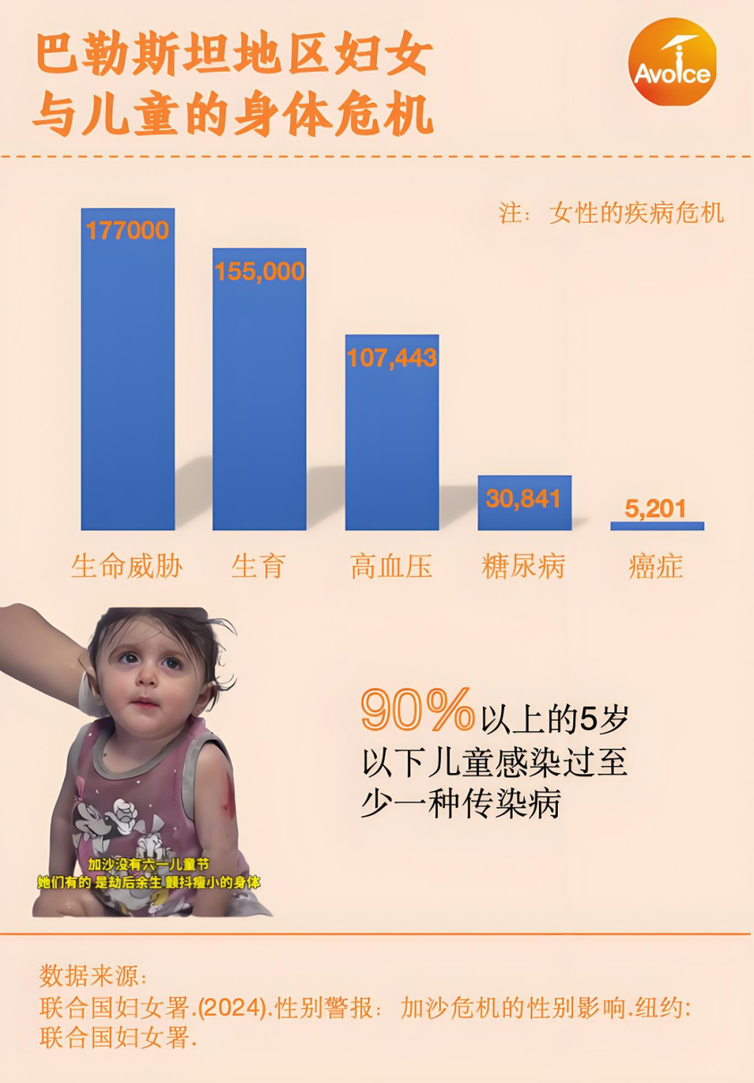 联合国人口基金报告显示,加沙大约有540,000名育龄妇女,战争爆发后的47天内,已有7,000多名妇女分娩,预计2024年3月将达5,500人。在175名有哺乳期母亲的受访家庭中,55%的人表示无法纯母乳喂养或需要配方奶粉辅助喂养。此外,加沙有337,057名5岁以下儿童易感染水传播疾病, 因此约110万妇女和女童亟需充足的安全水源。