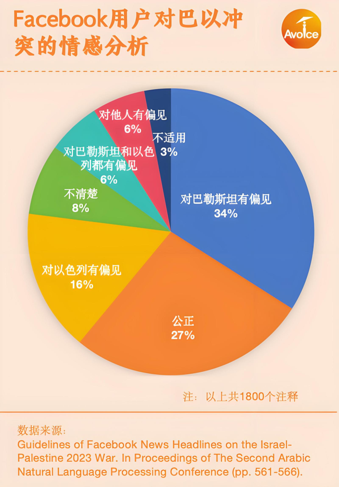 而媒体报道的偏颇和归因回避直接影响了世界民众对巴勒斯坦和以色列的态度。El-Ghawi分析了Facebook与巴以冲突有关的13,500个帖子的文本内容,发现大多数词汇搭配都带有情感色彩,这会塑造读者对某些实体的看法,例如使用“恐怖分子”来指代巴勒斯坦人,或使用“占领”来指代以色列人。通过对帖子的情感色彩进行标注,研究发现记录最高的标签是 “对巴勒斯坦有偏见”,在总共 1800 个注释中占 34%,其次是“公正”(27%)、“对以色列有偏见”(16%)、“不清楚”(8%)、“对巴勒斯坦和以色列都有偏见”(6%)、“对他人有偏见”(6%)和“不适用”(3%)。