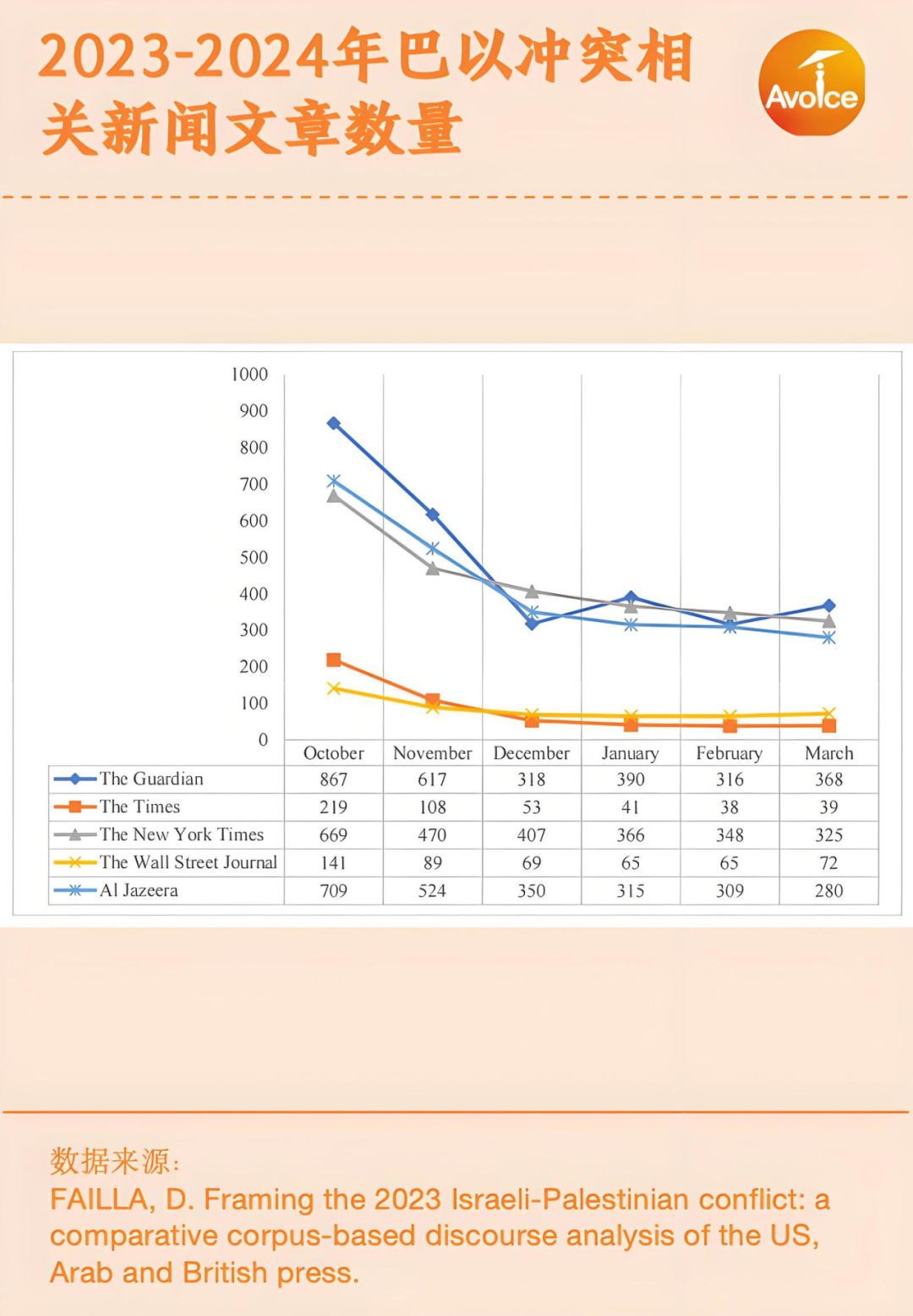 FAILLA分析了《卫报》、《泰晤士报》、《纽约时报》、《华尔街日报》以及半岛电视台2023-2024年关于巴以冲突的报道。从报道数量来看,五家媒体关于巴以冲突的报道呈下降趋势。从报道倾向来看,《华尔街日报》和 《泰晤士报》传统的西方报纸倾向于使用“占领”、“占有”这样的词汇来描述以色列的军事行动,而半岛电视台则倾向于使用“屠杀”和“攻击”。在3月1日的大屠杀中,《泰晤士报》写道大多数巴勒斯坦人死于踩踏事件,从而规避掉了造成死亡的真正的始作俑者。此外,西方媒体虽然报道了加沙地区陷入饥荒、营养不良和缺乏医疗设备的现状,但是对于资源短缺的原因则只字不提,从而减轻了以色列的责任。