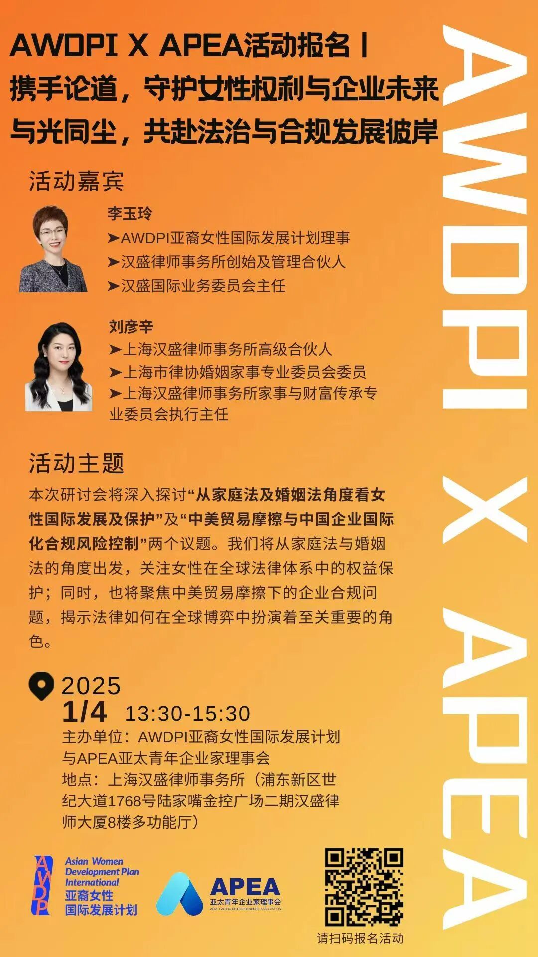 本次研讨会,AWDPI亚裔女性国际发展计划APEA亚太青年企业家理事会携手共同探讨在这片快速变动的法治沃土中,如何守护女性的权利,如何为企业在纷繁复杂的国际法律环境中找到一条合规发展的光明路径。本次研讨会将深入探讨 “从家庭法及婚姻法角度看女性国际发展及保护”“中美贸易摩擦与中国企业国际化合规风险控制” 两个议题。我们将从家庭法与婚姻法的角度出发,关注女性在全球法律体系中的权益保护;同时,也将聚焦中美贸易摩擦下的企业合规问题,揭示法律如何在全球博弈中扮演着至关重要的角色。通过本次研讨会,我们希望能够为每一位参与者播种智慧的种子,点亮行动的明灯,共同迈向更加公正、可持续的未来。
