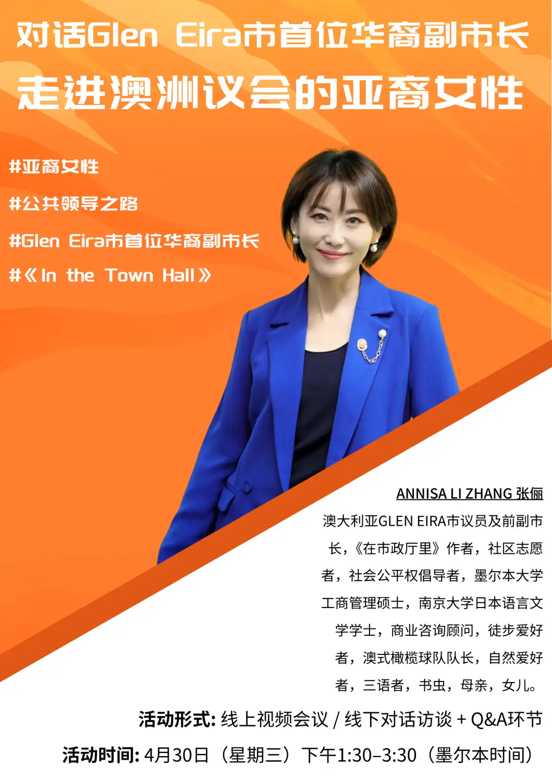 本次对话活动,我们诚邀她与大家展开一场深入而真诚的访谈。在访谈中,她将分享作为亚裔女性,自己如何走上公共领导 之路的心路历程,也将回应在澳洲社会中,亚裔女性普遍面临的挑战与她们所拥有的独特价值。同时,她也将结合自身在多元文化项目与组织中的丰富实践经验,讲述如何借助这些平台推动亚裔女性的成长、发声与赋权。
