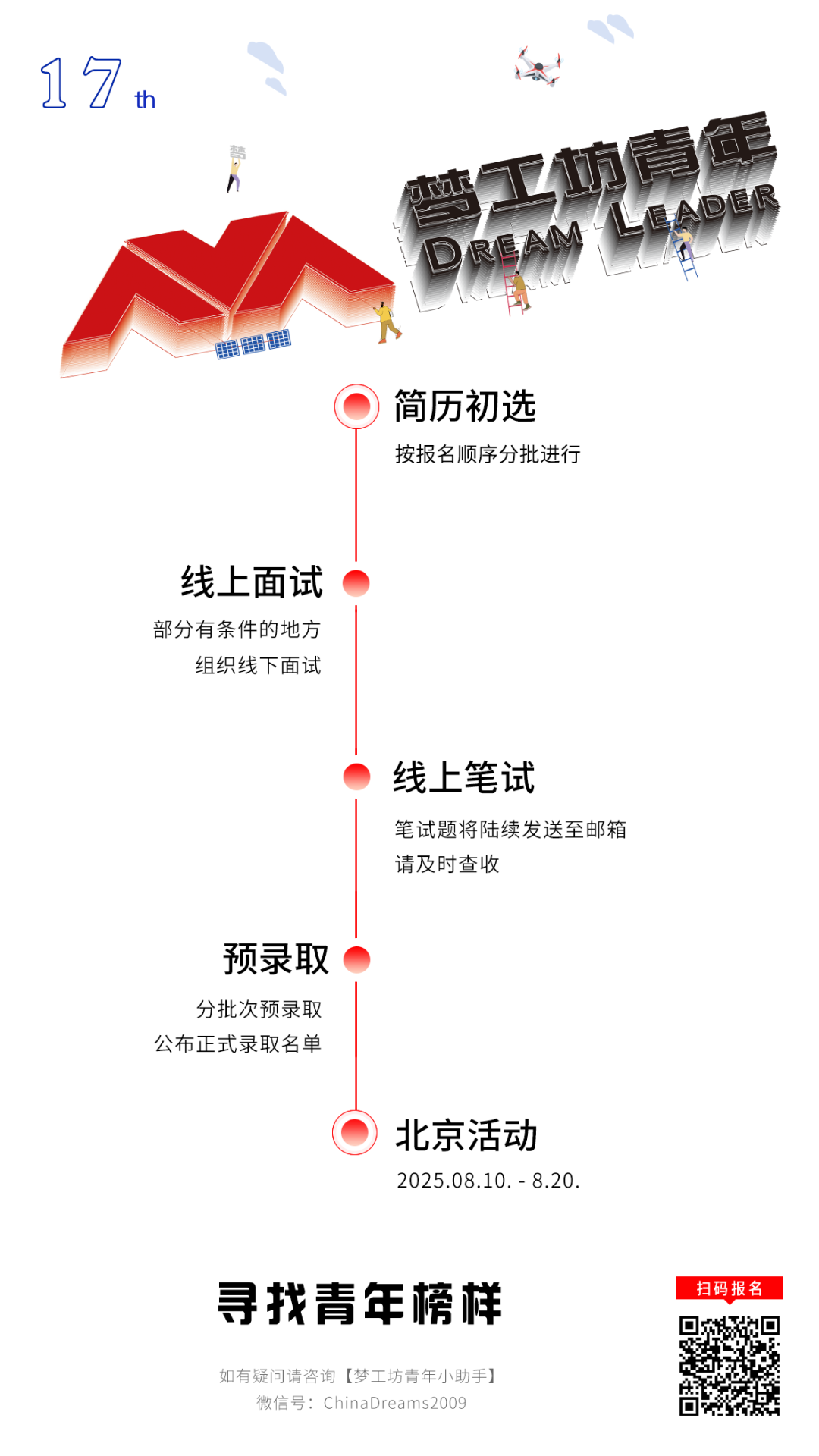 将在2025年夏天推出的第17届梦工坊青年大学生就业与创业人才计划将升级活动内容,打造 “北京梦想孵化营”“知名企业参访”“CEO时间”“人工智能访学”“梦想种子计划”“实习就业直通车”“导师思想课”“微电影大赛”“创新创意大赛”等多元项目,通过丰富的活动形式和实用的资源支持,为青年大学生搭建实现梦想的舞台。