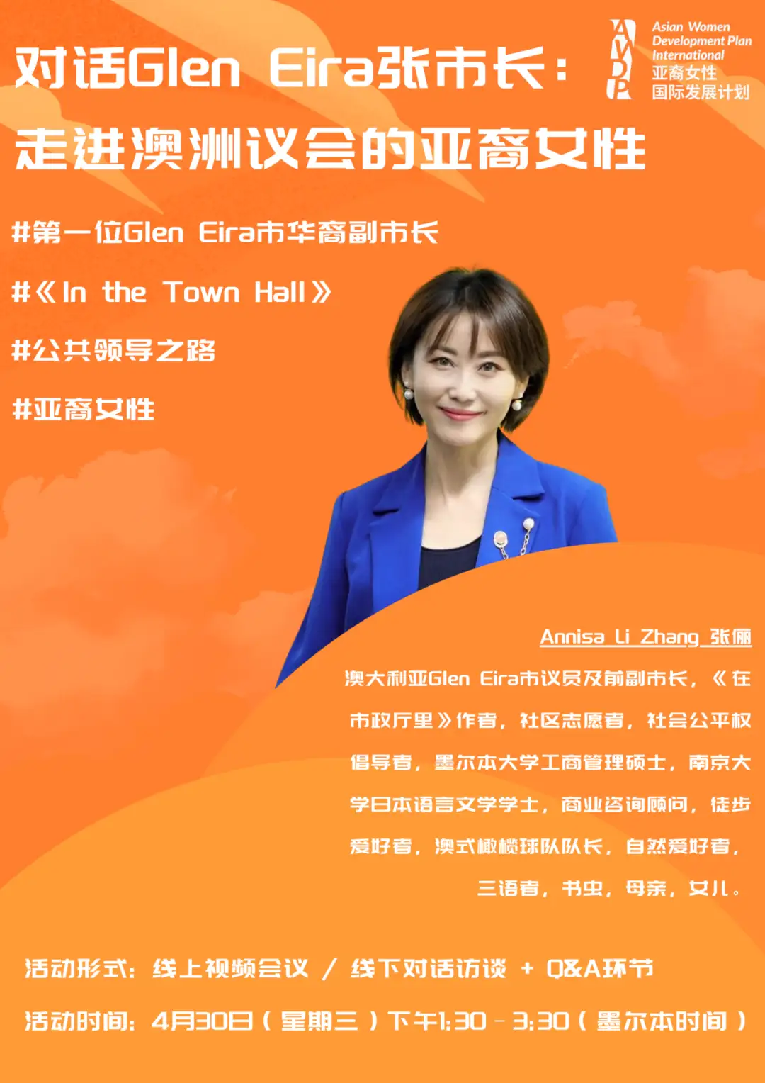 2025年4月30日,亚裔女性国际发展计划(AWDPI)澳大利亚国家办公室于墨尔本成功举办了一场以亚裔女性领导力为主题的访谈活动。澳大利亚Glen Eira市首位华裔副市长张俪(Annisa Li Zhang) 与AWDPI澳大利亚发起人兼负责人桂嘉泽Cindy展开深度对谈,吸引50余位线上线下观众共同关注亚裔女性在公共领域的角色突破与影响力提升。