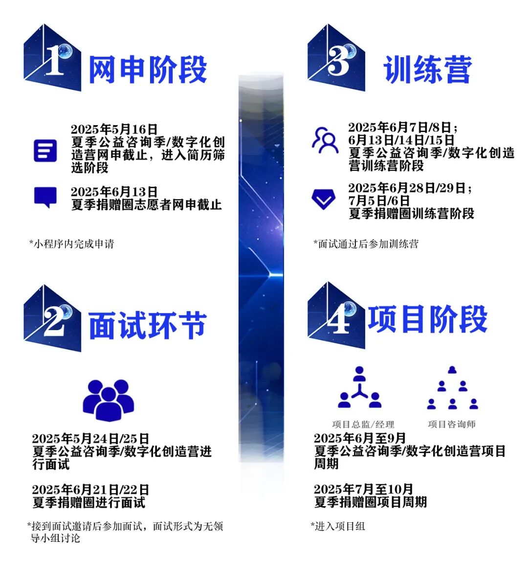 若您已完成上述所有步骤,则您已完成咨询志愿者申请流程;若未完成,请务必在截止日(公益咨询季及数字化创造营招募截止日期2025年5月16日/捐赠圈招募截止日期2025年6月13日) 前完成相应步骤。