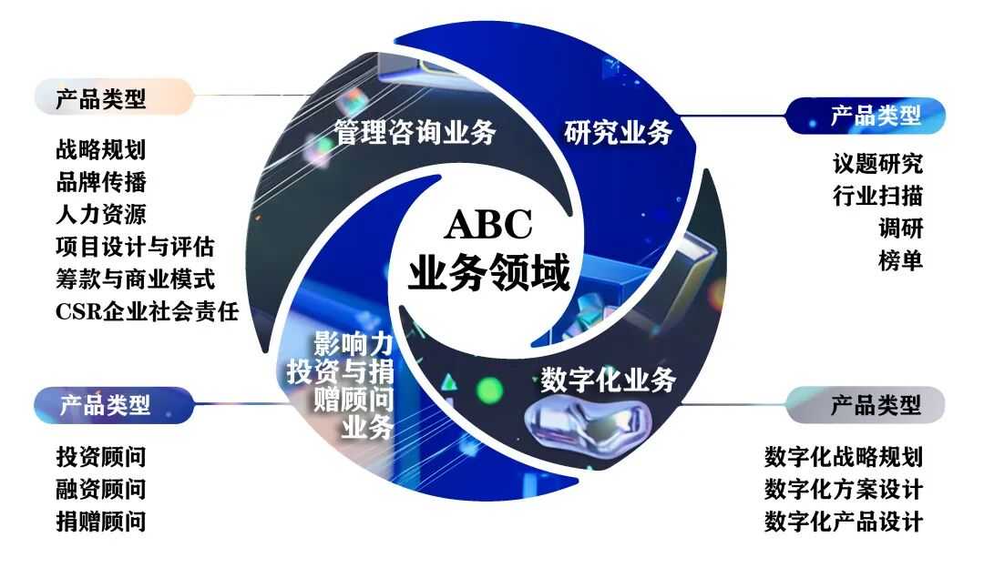 ABC以“公益咨询季”、“数字化创造营”、“捐赠季”为载体,业务范畴触达到公益机构的全生命链条, 从包括战略规划、品牌传播、项目设计与评估、人力资源、筹款、企业社会责任(CSR)、公益议题研究调研、影响力投资与捐赠顾问以及数字化公益方向,为公益机构解决不同发展阶段所遇到的问题。