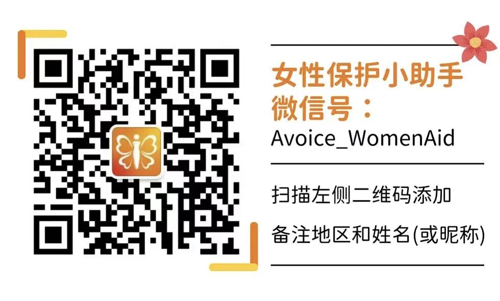 扫码添加 Avoice女性保护小助手 (微信号: Avoice-WomenAid ),接入 AWDPI 跨部门支持网络(语言/心理/法律/庇护/安全发声),或加入海外华人女性互助社群。