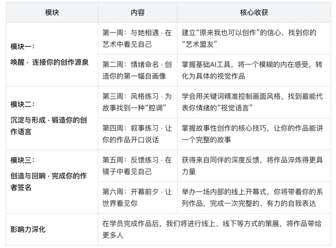 这不是一门美术课,这是一场自我发现的创作实践。你将跟随我们精心设计的三个模块,共六节课程,一步步进行自我探索与发现,并且将这些发现变成创造的动力与素材,在AI工具的支持下,完成自我表达。