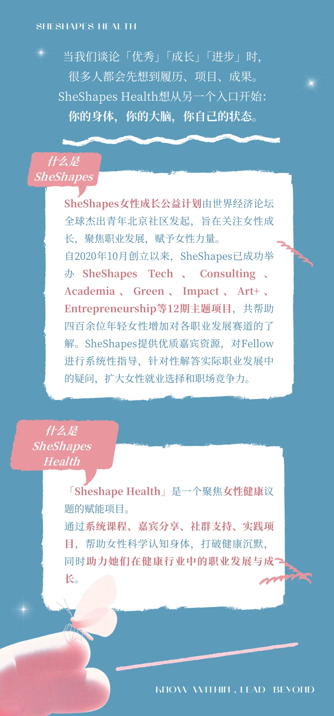SheShapes是由世界经济论坛全球杰出青年北京社区支持的女性公益成长项目。赋能女性职业发展,提升女性决策能力。与她,予她,助她成长。